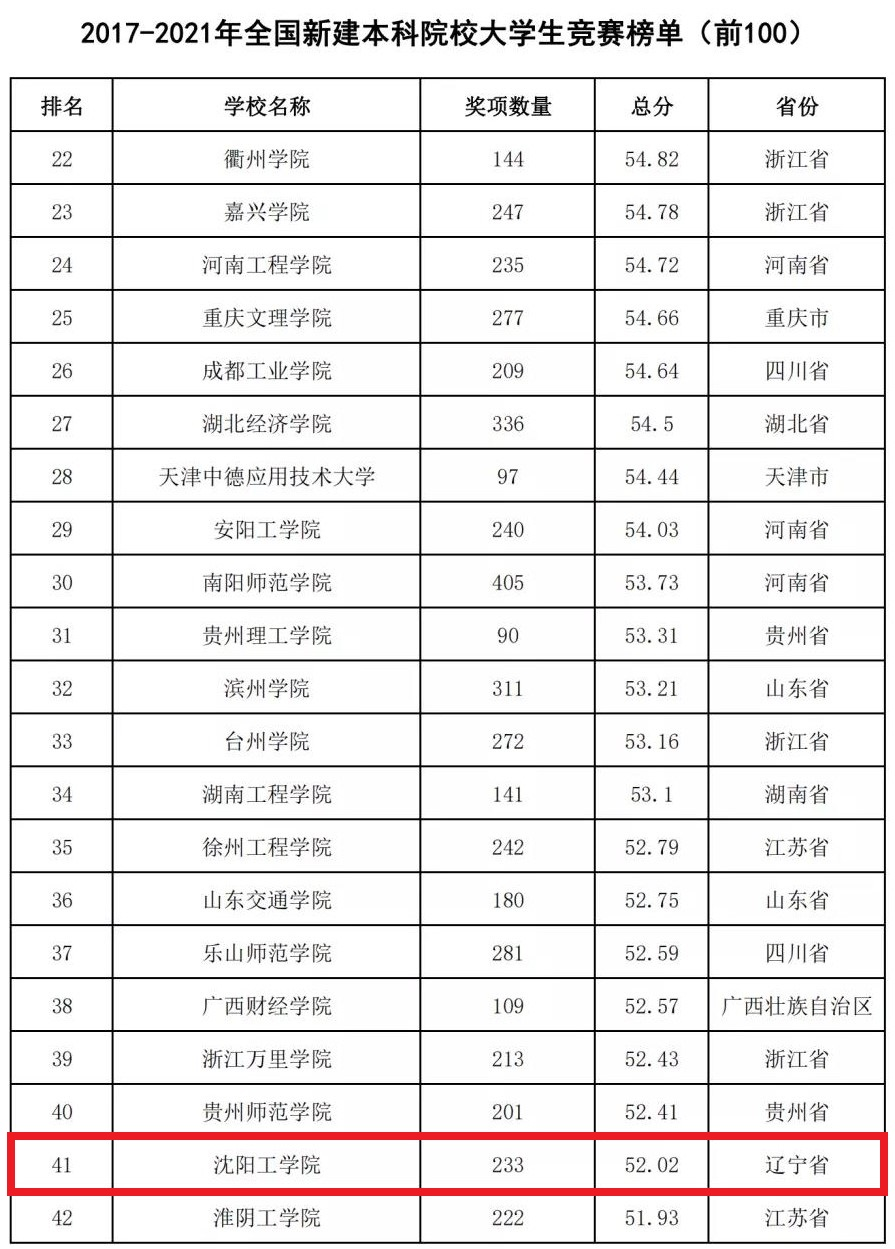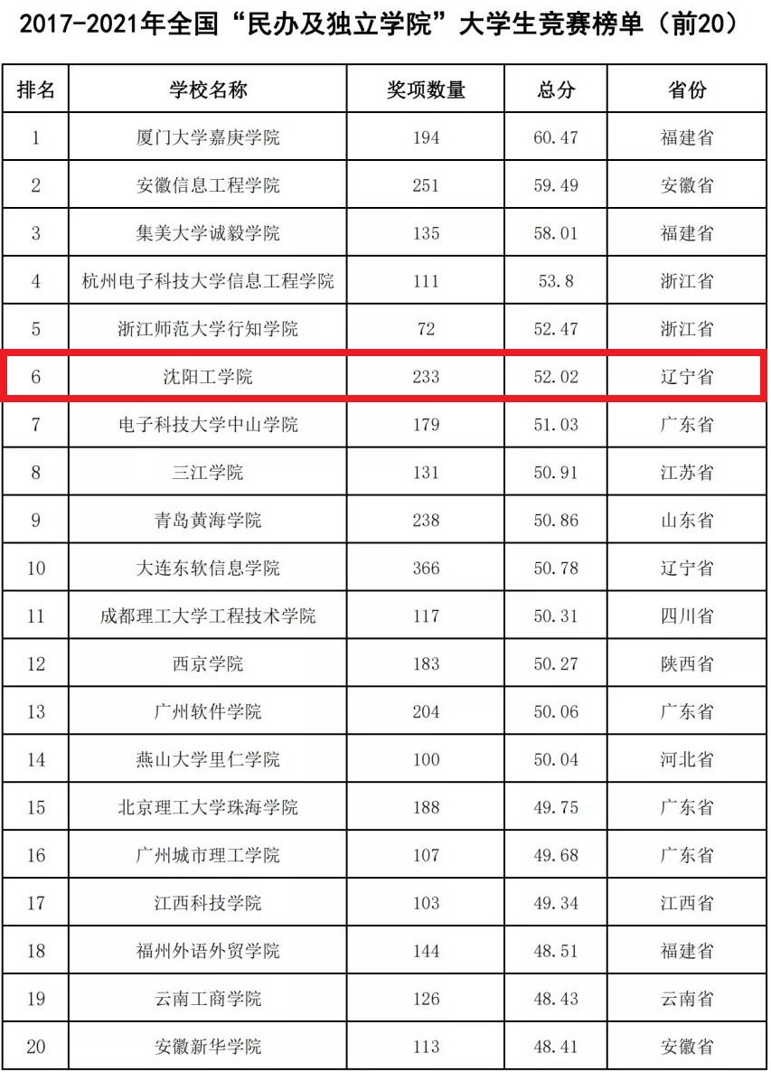 2022年2月22日,中国高等教育学会高校竞赛评估与管理体系研究工作组发布2021全国普通高校大学生竞赛分析报告,我校位列2017-2021年全国“民办及独立学院”大学生竞赛榜单第6名(辽宁省第1名),在2017-2021年全国新建本科院校大学生竞赛榜单中位列第41名(辽宁省第1名)。