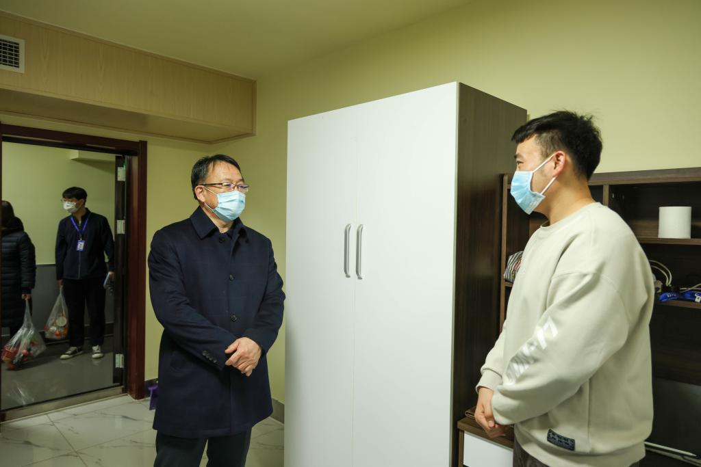 3月17日晚,李康举校长到寝室楼看望慰问了教工党员志愿者们,对志愿者的辛苦付出表示感谢,并勉励教工党员在疫情防控关键时期要迎难而上、冲锋在前,切实发挥好模范带头作用,在抗疫大考中进一步凝聚、激发、体现沈工人的精神和力量。