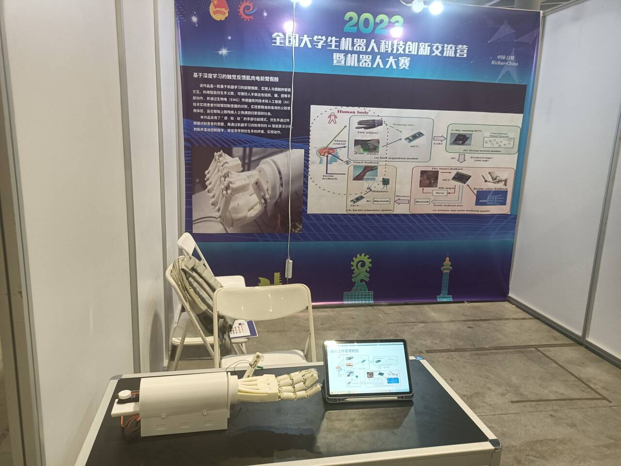 本届大赛共收到全国431所高校的1017件参赛作品,搭建工业机器人、个人及家用服务机器人、公共服务机器人、特种机器人、其他应用领域机器人五大赛道。我校学生参赛作品《基于深度学习的触觉反馈肌肉电前臂假肢》旨在帮助前臂截肢的残疾患者提升生活质量,作品融合人工智能、传感器技术、3D打印、微控制技术,仿生手部“感-知-动”的功能,通过传感器识别患者的意图,采用机器学习进行模型训练优化AI智能信号分析算法,判断并发出控制指令,将信号传到前臂假肢的终端,最终实现动作控制。