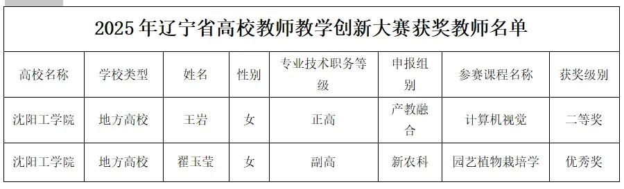 5月25日,由辽宁省教育厅主办、大连理工大学承办的2025年辽宁省高校教师教学创新大赛决赛圆满收官。本次大赛以“推动教学创新,培养一流人才”为主题,全省66所高校共360位教师(团队)参赛,最终共评选出特等奖25项、一等奖50项、二等奖75项,优秀奖100项。我校信息与控制学院王岩(产教融合正高组)荣获二等奖,生命工程学院翟玉莹(新农科副高组)荣获优秀奖,此外,我校因赛事组织工作成效突出,荣获辽宁省高校教师教学创新大赛优秀组织奖。