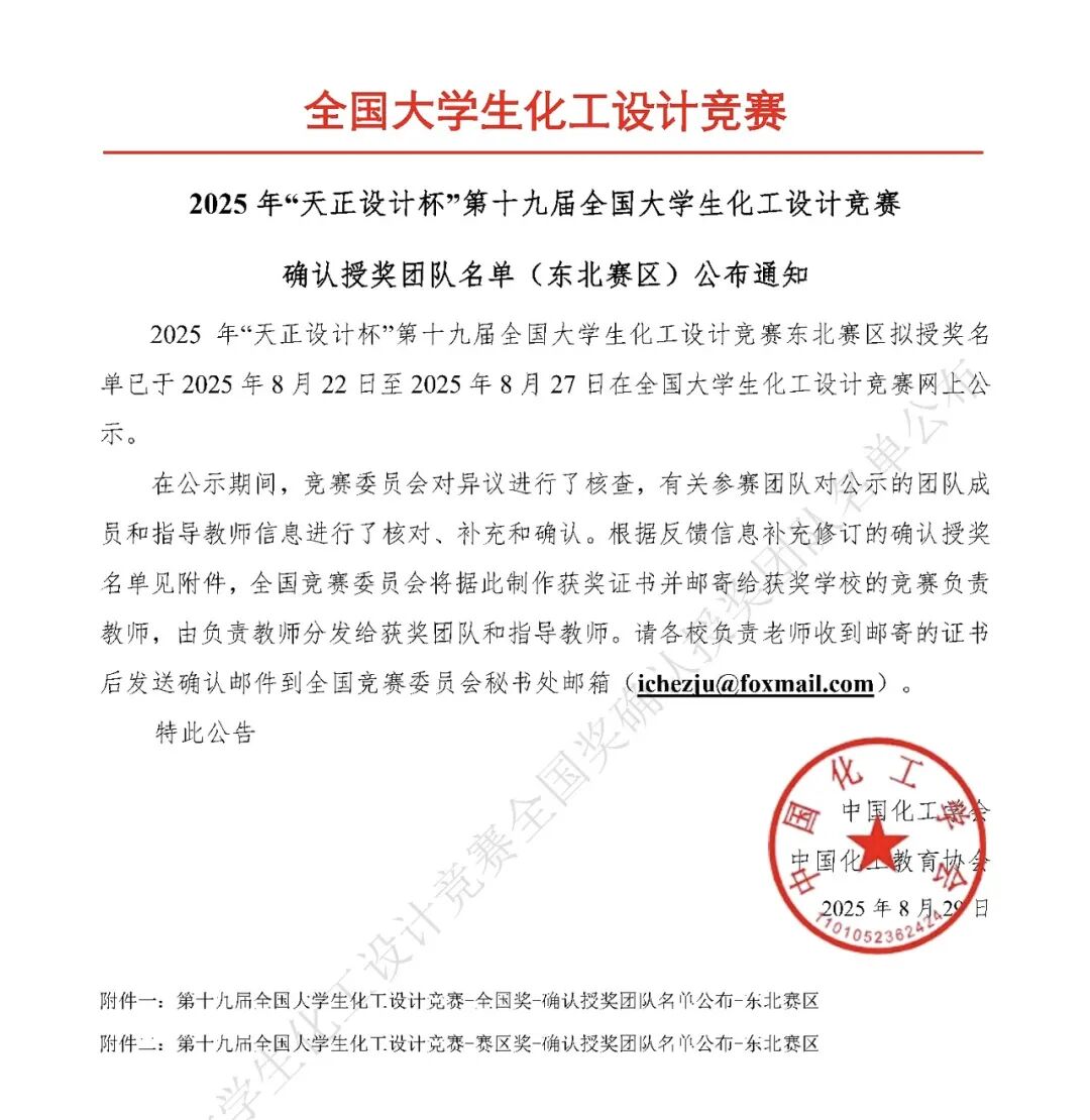 在刚刚落幕的第十九届全国大学生化工设计竞赛东北赛区决赛中,我校“我爱化学组”团队表现优异,荣获国家级二等奖。展现出扎实的专业功底、出色的创新能力和优秀的团队协作精神。